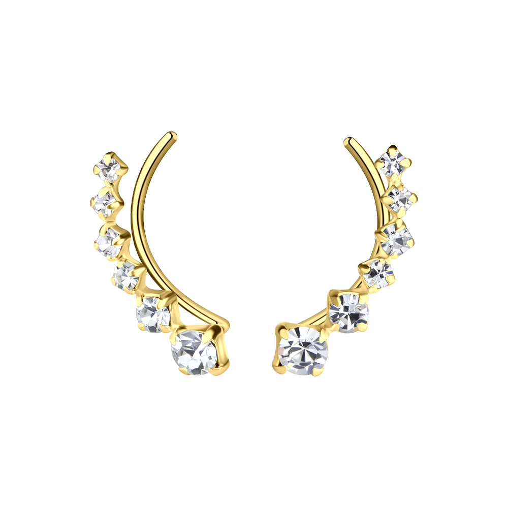 These elegant earrings feature a sleek silver curved line adorned with sparkling crystals. Plated with 14K gold and protected by an E-Coat for anti-tarnish durability, they offer a lasting shine. Designed to be nickel and lead-free, these hypoallergenic earrings ensure comfort and safety for sensitive ears, making them a perfect blend of style and practicality.